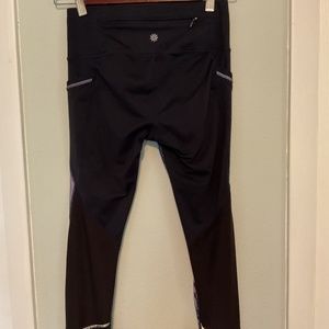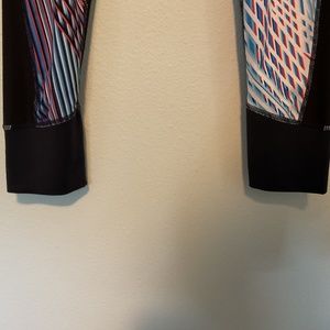 Athleta Mosaic Relay Capri navy multicolor patterned front and solid navy mesh in back. Side thigh pocket and secure waistband pocket, Stitching all in tact no rips or tears. Minimal if any signs of wear.