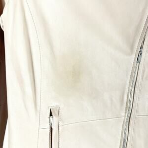 The item has tags, but has a large stain on the front. This jacket is best for a craft project or dying a dark color. MSRP is $498.
