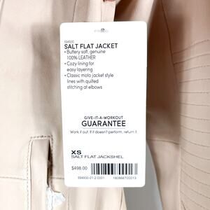 Athleta Salt Flat Leather Moto Jacket. Front zip with front zip closure pockets. Jacket is lined. Stamped silvertone hardware. Detail stitching throughout. Zippers at cuffs. Soft genuine leather.