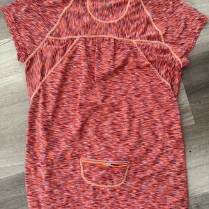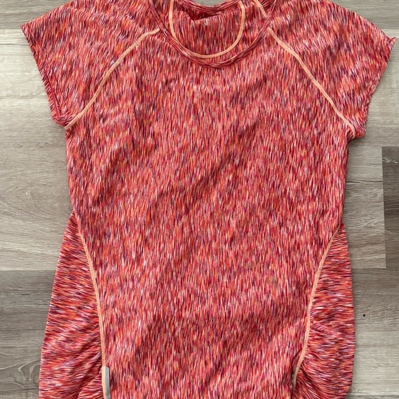 Dynamic multicolor top with a blend of red, pink, and orange. Ideal for active wear.