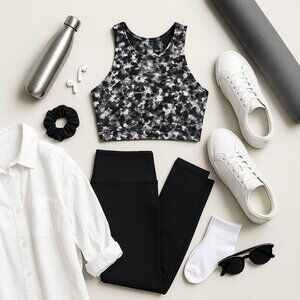 Keywords/Aesthetics: yoga bra, Pilates top, athleisure, high-neck crop, abstract print, inkblot, marble, watercolor floral.