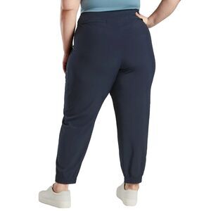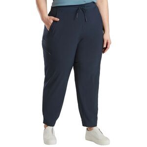 The Athleta Navy Blue Venture Pant in Plus Size 26 is a versatile activewear option for women. These tapered leg pants feature a drawstring closure, elastic waist, elastic ankles and blended fabric for comfort and stretch. With a waist size of 50 inches and an inseam of 29 inches, these athletic pants are perfect for various activities such as gym training, yoga, and running.