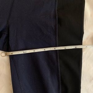 Women navy blue full length leggings amazing for athletic wear and lounging. It has a high waist design with black mesh lining along the legs. Has enough elasticity and it’s in great condition! On the other hand, it can attract lint, but with a roller you should be fine.