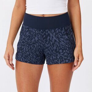 Athleta women's athletic shorts with a navy and black pattern. Ideal for workouts or casual wear.
