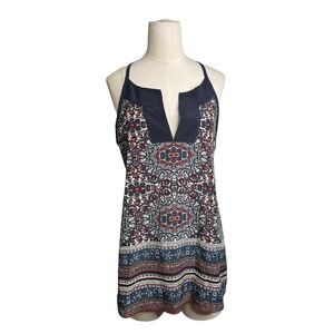 Chic boho tank with intricate patterns. Features a stylish navy and white design. Perfect for casual outings.