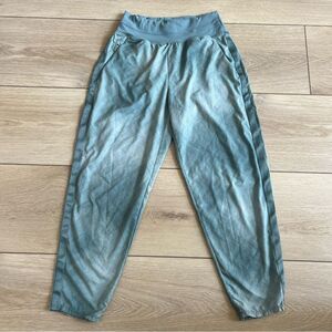 This stylish Athleta Nolita crop pant is perfect for any occasion, whether you're traveling, working or just running errands. The sea foam green and minimalistic gray color block pattern adds a touch of elegance to your wardrobe. The pant is made from recycled polyester and spandex that makes it comfortable, easy to care for, quick-drying, sustainable, and wrinkle-resistant.