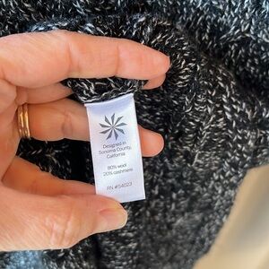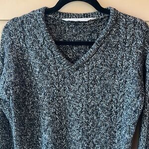 black and white cable knit sweater with long sleeves. Comfortable and cozy to wear. Cashmere and wool blend. Casual on the go sweater. Tunic length. V-Neck. Chunky