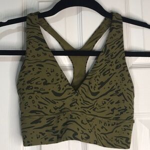 Stylish olive green sports bra. Features a unique pattern. Comfortable and supportive design.