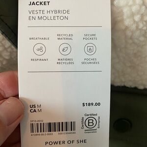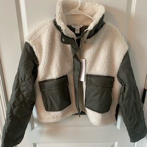 Cozy teddy jacket with olive sleeves. Features front pockets and a stylish design.
