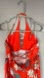 Vibrant orange one piece with floral design. Features halter neck and lace-up back.