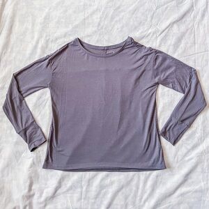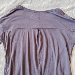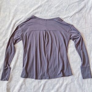 I did my best trying to identify this top. Probably one of the comfiest tops to wear and is made of an extremely soft/stretchy material. Holes for your thumbs, a ruffled back design, and woven seams. Pretty muted purple color in person. Fits girls who are a S/M and am taking the best offer!