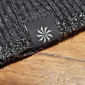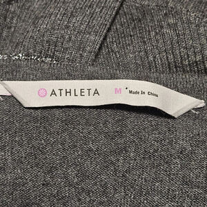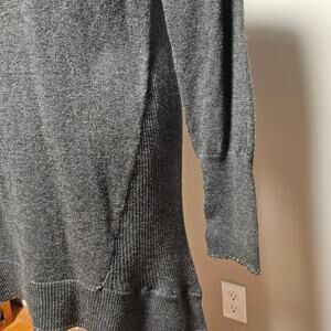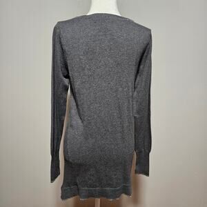 Athleta gray tunic sweater in a soft cashmere blend, size medium. Features a flattering scoop neckline, long sleeves with thumbholes for added comfort, and subtle metallic trim along the hem and cuffs. Perfect for layering, this versatile piece is ideal for casual wear, travel, or athleisure styling. Lightweight yet cozy, it pairs effortlessly with leggings, jeans, or skirts. A must-have for minimalist, casual chic, and cozy capsule wardrobes.