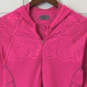 Athleta Paisley Jacquard Knit Form Fitting Quarter Zip Hooded Top Hot Pink M