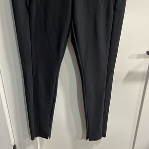 Solid black tight pants with slimming seams down front and back of legs, zipper close front pockets