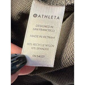 Athelta women's utility slim leg split hem pants. Pants are done in a dark gray. They are high waist, have a flat front, and zip up the back. Pants have two side utility pockets. They're made of a nylon spandex blend and are a woman's size 2.