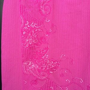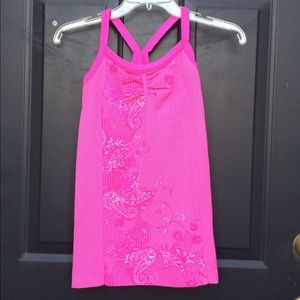 Lightly worn. Pink pattern top. Key hole cutout on the back. Built in sports bra. (M)