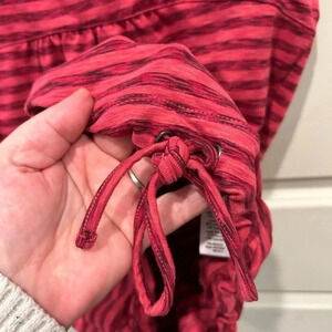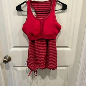 Built in sports bra. Last two pictures show the tank inside out to see sports bra. Tie.