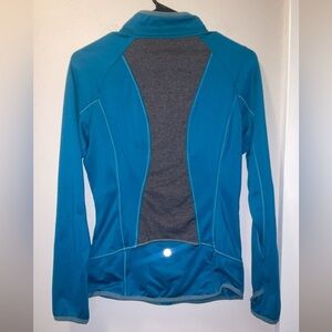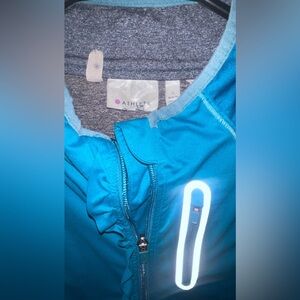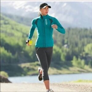 Preowned, excellent condition! Beautiful teal blue color. Athleta Prevail Ruffle Jacket size small. Zip pocket on each side, zip chest pocket and zip pocket on back near waistband. Ruffle stripe alongside zipper. Reflector around chest pocket and logo on back. Thumb holes. Pit to pit measures 18.5 inches, shoulder to hem measures 24 inches. Tag has wear but doesn’t affect the jacket.