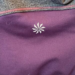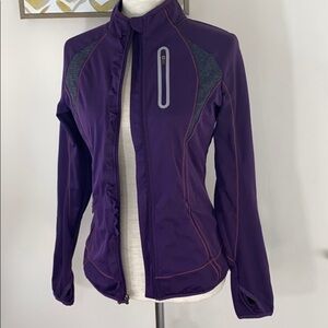 Athleta prevail running workout jacket with full zip and stand up collar. Side zip pockets and front breast zip pocket with reflective trim. Thumb holes at sleeves. Color block in grey and purple. Size Extra Small.