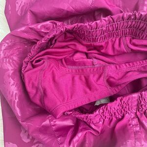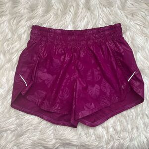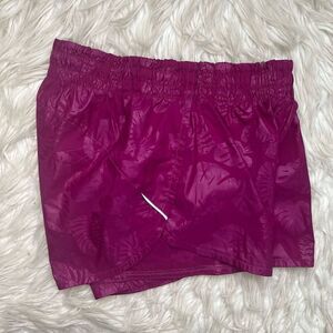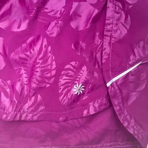 Athleta Print Racer Run Shorts in magenta with a palm monstera print
