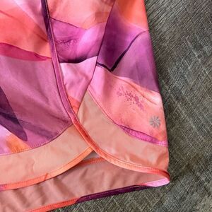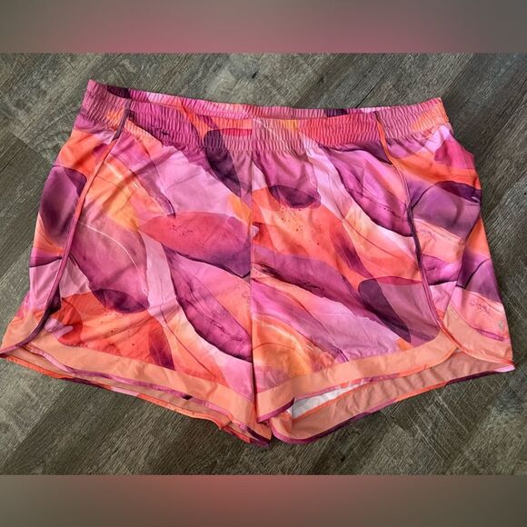 This listing is for a pair of NWOT's Athleta Printed Mesh Racer Run Mid Rise 4 Short in Orange/pink print in size 3X.