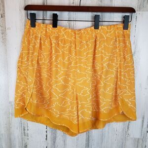 ~ Description: Golden yellow printed running shorts with brief lining, mesh vented panels, one hidden zipper pocket, elastic waistband with drawstring
