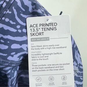 Designed for movement and performance, this Athleta Ace skort combines sporty function with stylish flair. Featuring a vibrant purple print and built-in shorts, it's perfect for tennis, pickleball, golf, or any active day. With a comfortable waistband and convenient side pockets, this skort offers both practicality and confidence in motion.