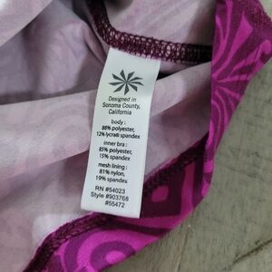Shades of purple and pink. Shelf bra. Perfect for yoga, gym, or a hike. Polyester/Lycra.