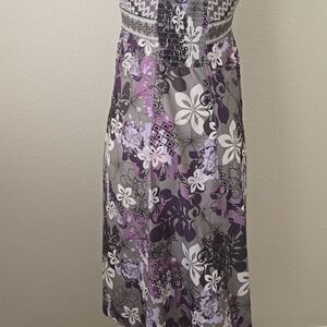 Stylish backless dress by Athleta. Features a halter neck and floral pattern. Perfect for casual outings. Great pre-owned condition. please refer to photos for more details and measurements. smoke-free home.