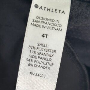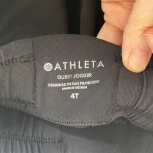 Never worn Athleta Quest Jogger pants in size 4 tall, black. Material is 83% polyester, 17% spandex, with mesh insets at the bottom of each leg for ventilation (94% poly/6% spandex). Adjustable belt at elastic waist, elastic leg openings. Excellent, never-worn condition, no rips or stains. Machine wash cold, tumble dry low.