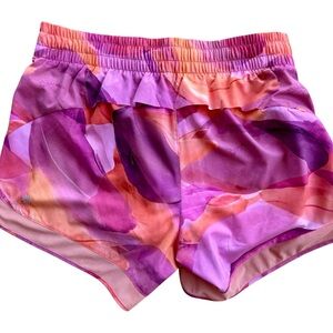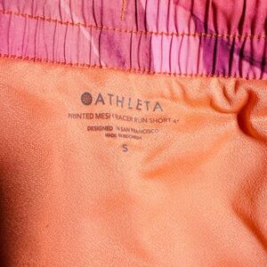 Athleta Printed Mesh Racer Run Short with 4” inseam. Ideal for workouts and casual wear. Features vibrant pink, purple and orange design.
