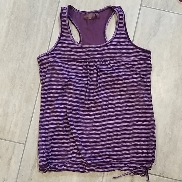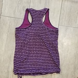 Purplish-Magenta Athleta Racerback Tank w, white stripes and purplish-Magenta dashed lines detail. Loved, just ready for some new tanks. Gently worn. Size: large.