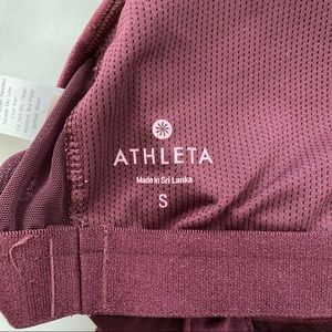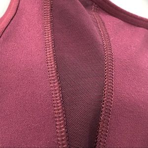 Athleta Racerback Tank size S. Burgundy purple color - in person a bit darker/more purple than the photos. Mesh detailing on the chest darts and the back. Built in bra and padding (included in purchase, but removeable). Pit to pit measures 13.5in across, shoulder to hem measures 23in. Gently worn, no flaws or stains.