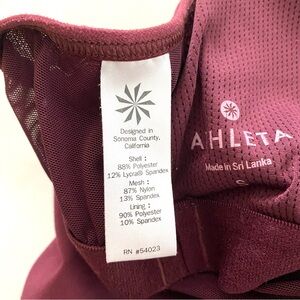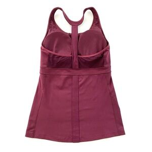 Athleta Racerback Tank size S. Burgundy purple color - in person a bit darker/more purple than the photos. Mesh detailing on the chest darts and the back. Built in bra and padding (included in purchase, but removeable). Pit to pit measures 13.5in across, shoulder to hem measures 23in. Gently worn, no flaws or stains.