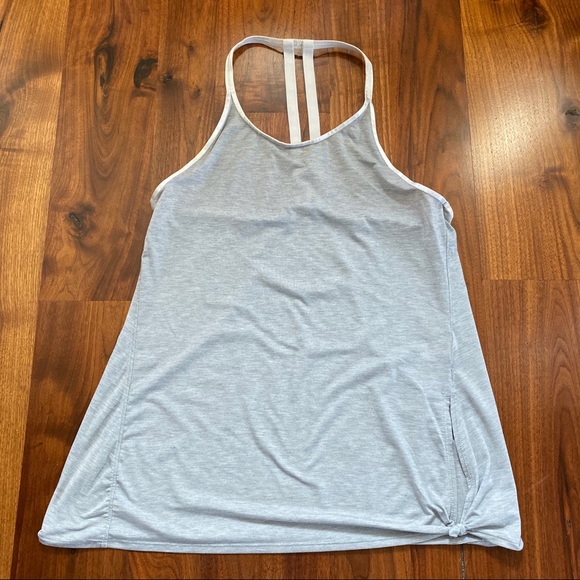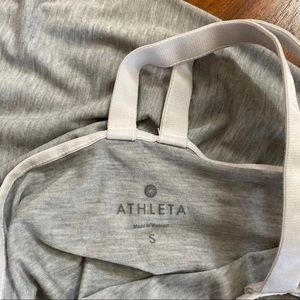 Athleta Racerback Top Size Small. Grey sport material with thick straps in racerback design. Knot tie at the front left hem. VGUC- mild stiffness of the off white straps. From a non-smoking and pet-free home.