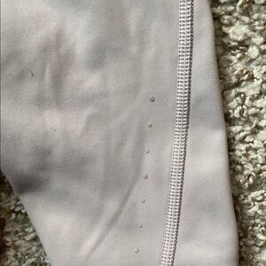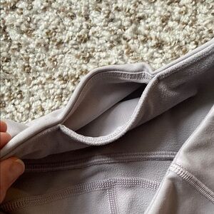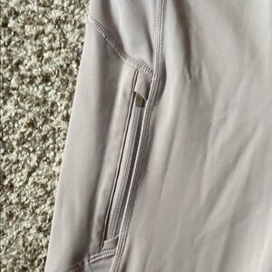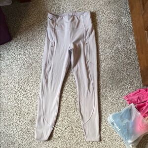Comfortable and stylish leggings. Perfect for workouts or casual wear. Soft fabric with a sleek design. Fleece like inside, warm. Hidden back pocket, front zip pockets, small reflectors on back of calf. Color is lilac.