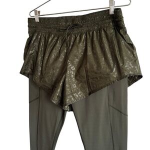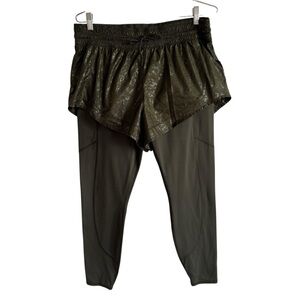 Athleta "Rainier" tights with attached metallic detailed shorts layered over top- awesome for cooler workouts. Size Large and in great preowned condition; no visible flaws.