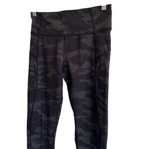 Athleta's Rainier Reflective Tight in a black camo print. Size Small and in great preowned condition; no visible flaws.