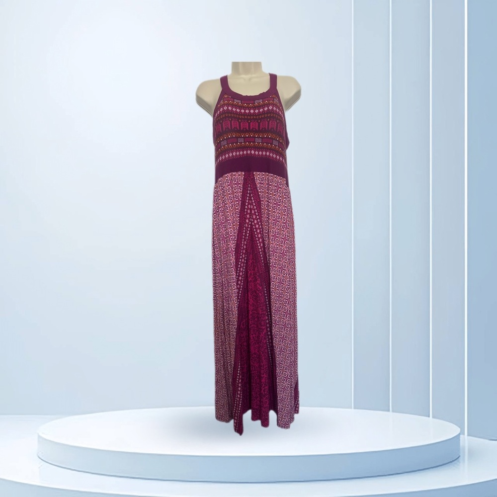 Chic burgundy maxi dress with intricate patterns. Sleeveless design for a stylish look. Ideal for casual outings or special events.