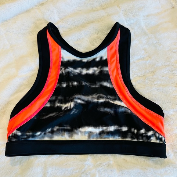 Sports bra-like razor back bikini color block top, high neck, lightly padded. EUC