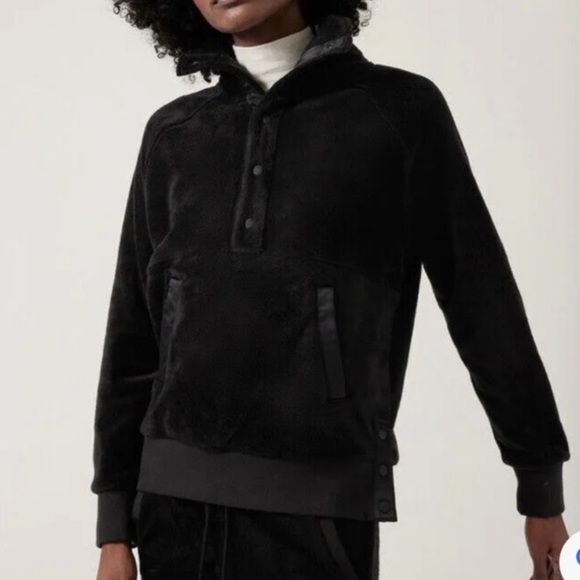 Keywords: Athleta fleece pullover, cozy snap sweatshirt, women’s black fleece, Athleta Recover top, loungewear, fall layering, athleisure