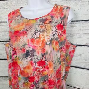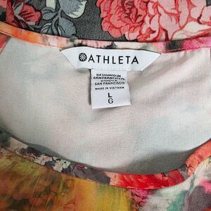 Athleta women’s sleeveless floral tank, size Large. Vibrant multicolor pink, coral, yellow, and gray floral print. 86% polyester, 14% spandex. Soft, breathable, and flowy fabric. Perfect for layering or casual wear. Made in Vietnam.