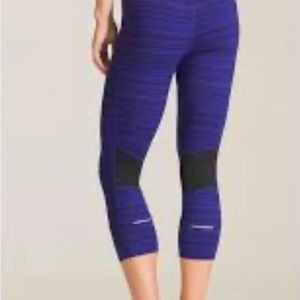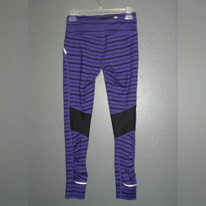 Athleta Purple and black stripe athletic workout leggings. Ruched at bottom of legs, black mesh panel, zipper pocket on back. Size small. Inseam: 26”