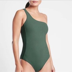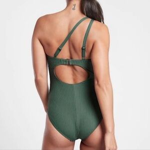 Lovely swimsuit from Athleta, in excellent condition. Size medium, moderate seat coverage, best for cups A-C, one shoulder, adjustable straps, with compressive living that provides a flattering and supportive hold.