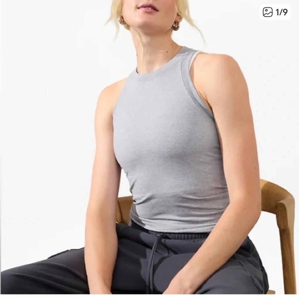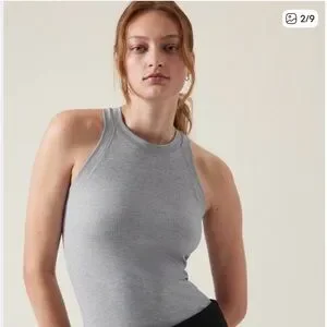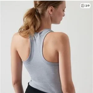Soft ribbed knit offers gentle stretch. Racerback silhouette for freedom of movement. Lightweight sleeveless design ideal for layering. Neutral light gray pairs with many styles.