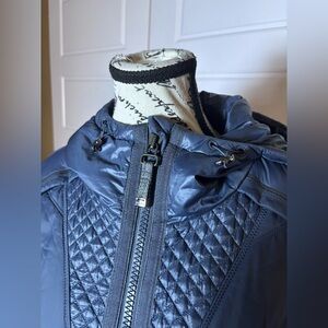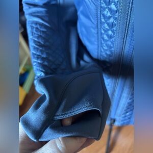 SEO words: Athleta jacket, Rock Ridge jacket, PrimaLoft jacket, hooded jacket, insulated jacket, quilted jacket, mixed media jacket, athletic jacket, performance jacket, running jacket, hiking jacket, gym to street, thumbhole cuffs, full zip jacket, blue gray jacket, fitted jacket, longer length jacket, lightweight warm jacket, activewear outerwear, women’s medium jacket