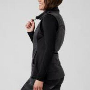 Excellent athletic vest, very stylish, functional, and great for running or around town. Two-way zipper with a combination of spandex and quilting. Multiple pockets. Only worn a few times, stored in a smoke-free, pet-free home. Pit to Pit is 18 inches, bottom is 21 inches, and length is 26 inches. No stains, rips or marks. For reference in the picture, I am 5'5" and 150 lbs.