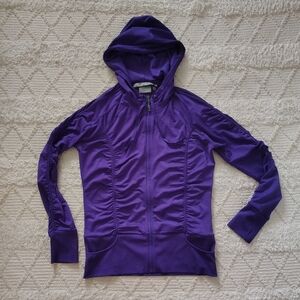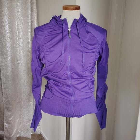 Chic lavender jacket with a zip closure. Features a cozy hood and ribbed details.
