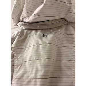 EUC. Athleta Run On Jacket White Striped Hidden Hood Windbreaker. Length 25in, pit to pit 21in. Some wear on it but still in great shape.
