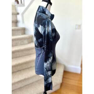 Excellent condition. Slate blue body with abstract navy accents. Quarter zip, mock neck, long sleeves with thumb holes.